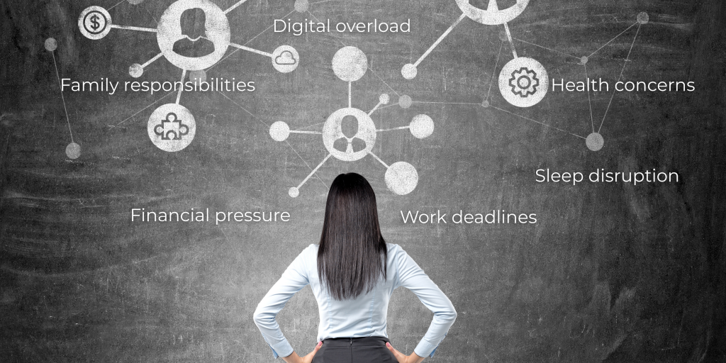 Work deadlines , Financial pressure , Family responsibilities , Digital overload , Sleep disruption and Health concerns.